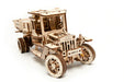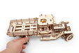 By implementing the visible-gear design of steampunk fantasy machines, this truck captures features of early- to mid-20th century trucks, complete with a rail-lined flatbed for hauling goods or produce. Made of premium plywood that offers the smell of fresh-cut wood, each piece is laser cut for a perfect fit. Parts are carved with realistic details, including full-tread tires, wheels with hubcaps and lug nuts, headlights with covers, and stamped-steel running boards to help the driver and passengers get into and out of the cab without slipping. Even the license plate is as authentic as possible, featuring numbers and letters.