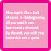 "Marriage is like a deck of cards. In the beginning all you need is two hearts and a diamond. By the end, you wish you had a club and a spade."