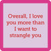 Overall, I love you more than I want to strangle you. Coasters are 4”x4” and made with resin with a cork backing and round corners. Made in the USA.