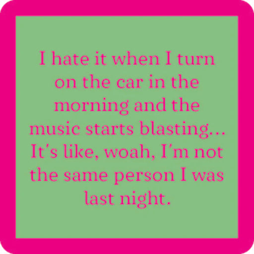 Drinks On Me Coasters“I hate it when I turn on the car in the morning and the music starts blasting…It’s like, whoa, I’m not the same person I was last night.” Coaster...