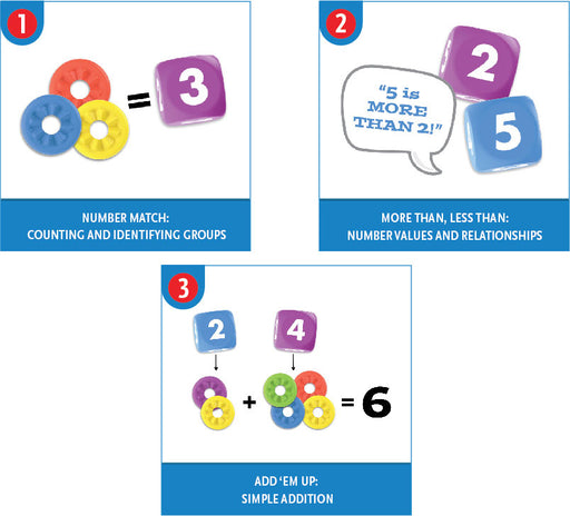 Think FunChunky dice and colorful counter chips help build pre-Kindergarten math confidence. Play is quick and teaches number sense & focus.