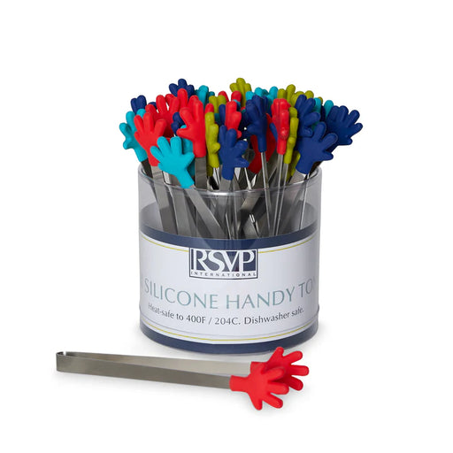 RSVPCDU 24 Pieces in a plastic tub in assorted colors Tongs are 5-3/4 inches in length Plastic Tub CDU measures 6.5 x 4.5-inch in diameter Made from B...