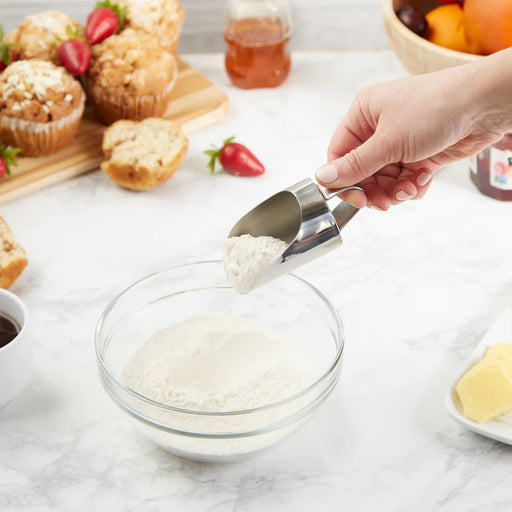 RSVPScoop measures 4.5 inches by 2 inches by 2 inches, and has an approximate capacity of one-third cup. The convenient handle also features an easy sc...