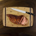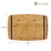 The Totally Bamboo 18" Marbled Bamboo Serving and Cutting Board is a beautiful option to both cut and serve. The board features twin gorgeous inlays of crushed bamboo that are masterfully crafted to create a stunning "marbled" look. This inlay strip blends wonderfully with the vertical-grain bamboo construction of the board. The 18" Marbled Board features a juice groove along the edge of the board to collect any run-off from juicy meats or fruits — keeping countertops clean! When the meal is done, the board cleans easily with hand washing; do not soak or wash in the dishwasher. The board measures 18 inches by 11-3/4 inches and is 3/4 of an inch thick. Add a stylish flare to your kitchen with the 18" Marbled Serving & Cutting Board!